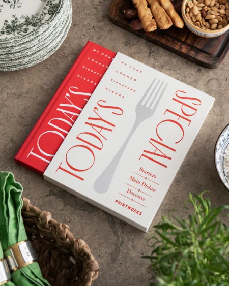 KD15.700In this elegant recipe book, you can easily write down recipes and cooking ingredients for all your favorite dishes. Simply put, it’s a cookbook with only the dishes you like the most. The book contains 50 sheets (100 pages) of wood-free paper with lines for ingredients and directions, and has an ivory white slipcase designed to protect and store the vibrant red-colored book. -