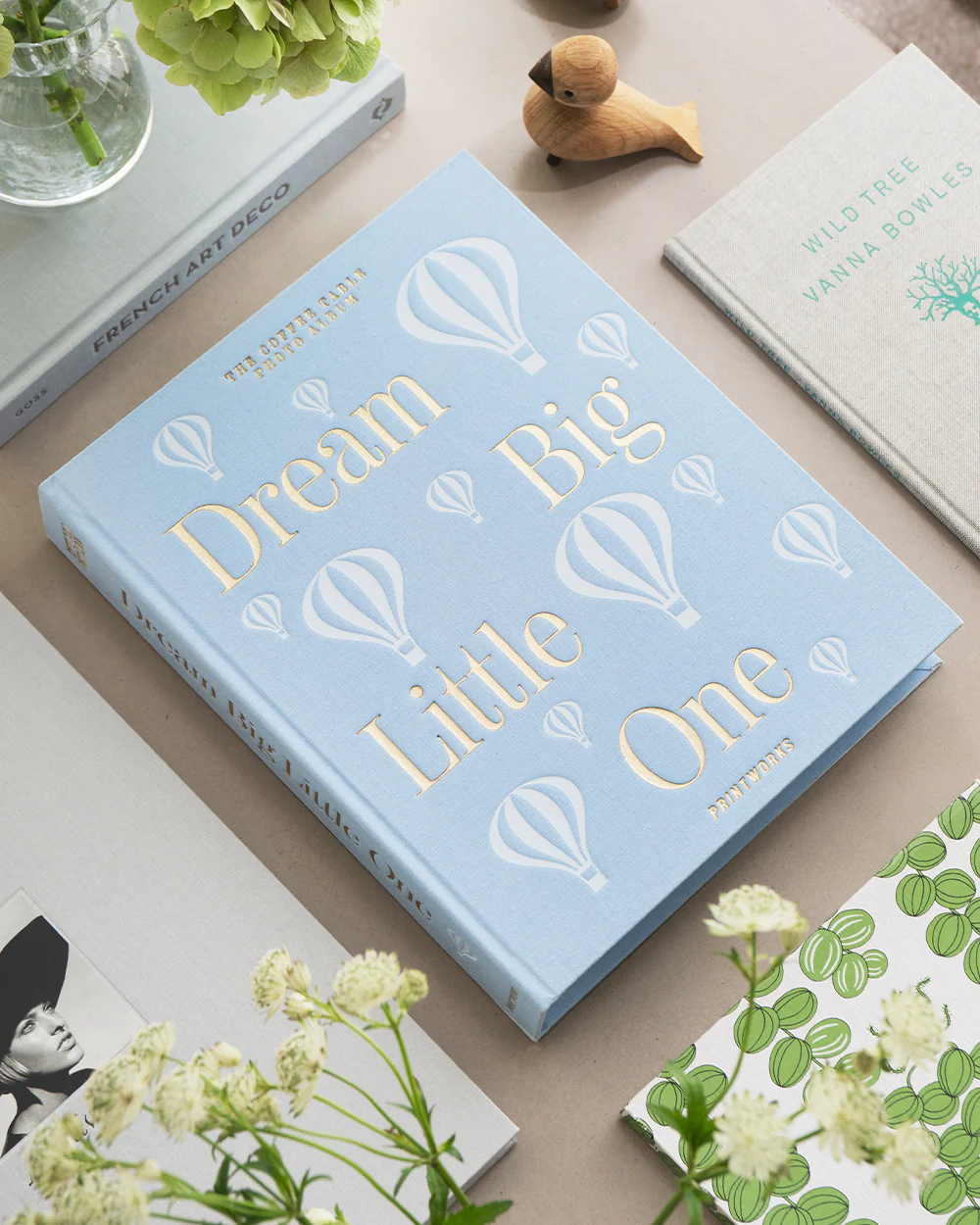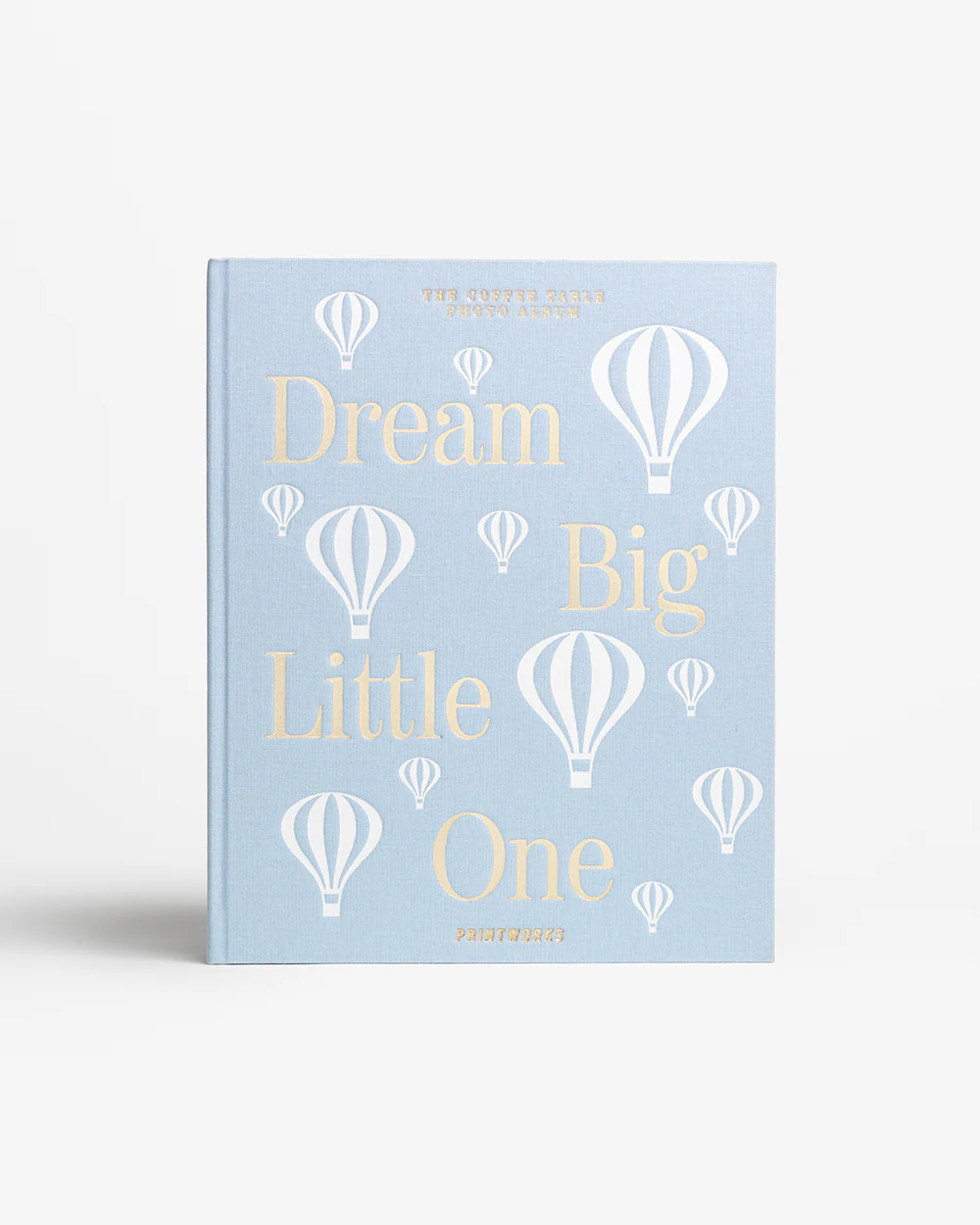 Capture and cherish your baby’s first years with our charming coffee table photo album Dream Big Little One, featuring a light blue cloth cover with gold folied text and white silkscreen balloon prints.
