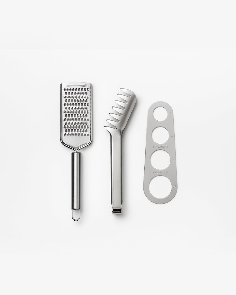 Discover our Essential Kit for Pasta Nights, cleverly disguised as an elegant book-like box. It is the perfect fusion of aesthetics and functionality. Upon opening it, you will discover all the essential tools for hosting successful pasta dinners. All tools are made of stainless steel and are dishwasher safe.