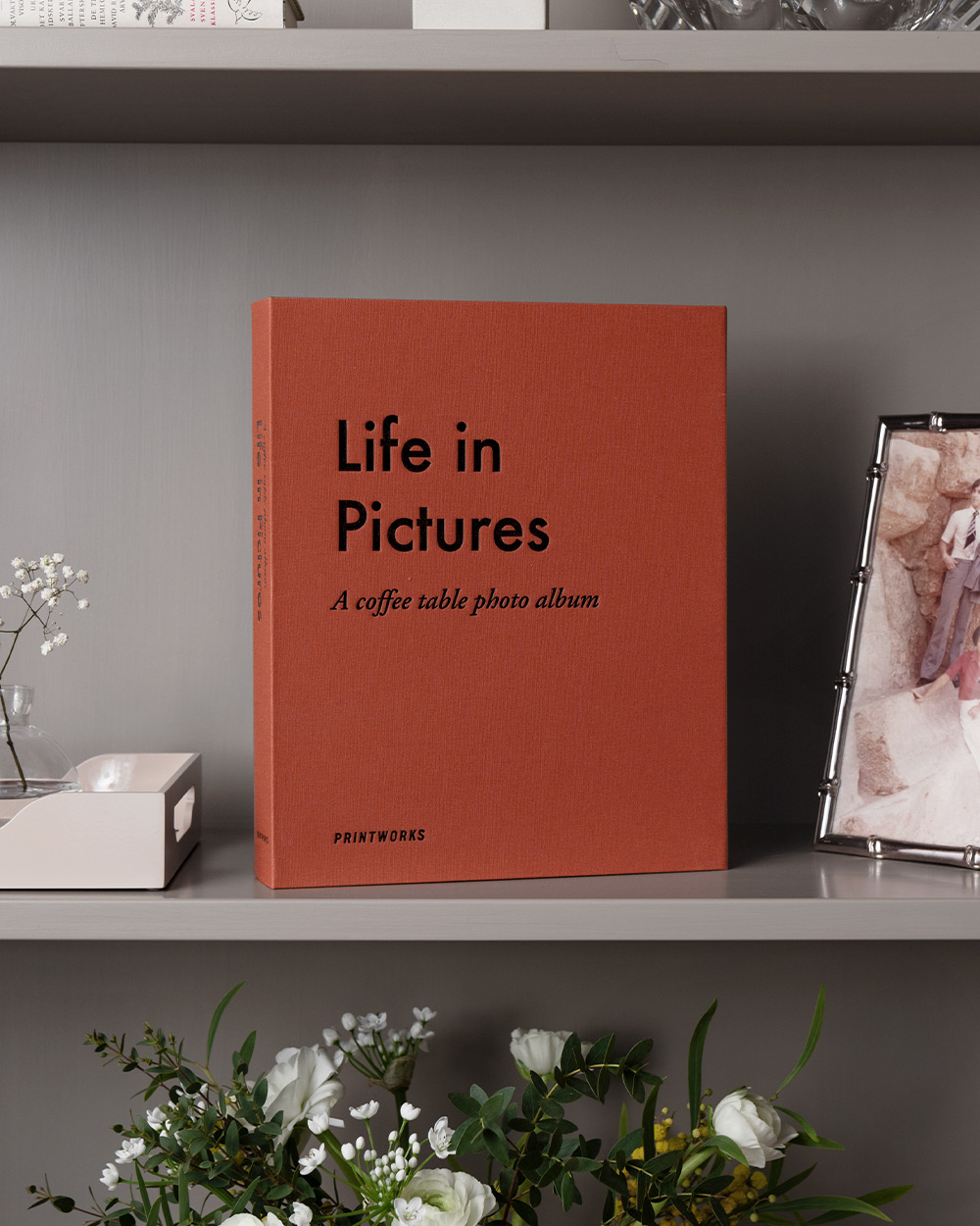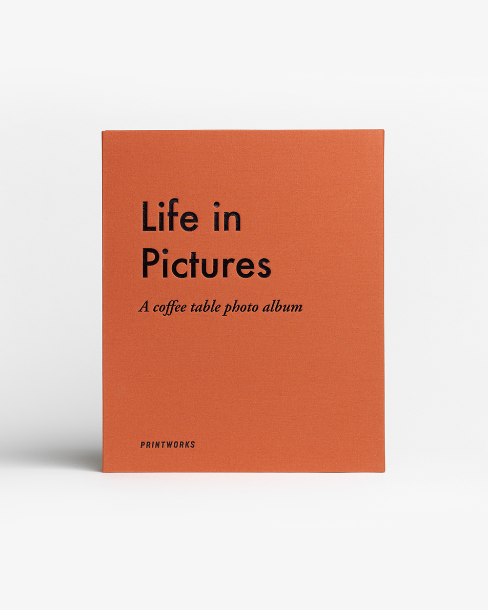 Discover our Life in Pictures coffee table photo album, featuring an elegant terracotta cloth cover with black text.