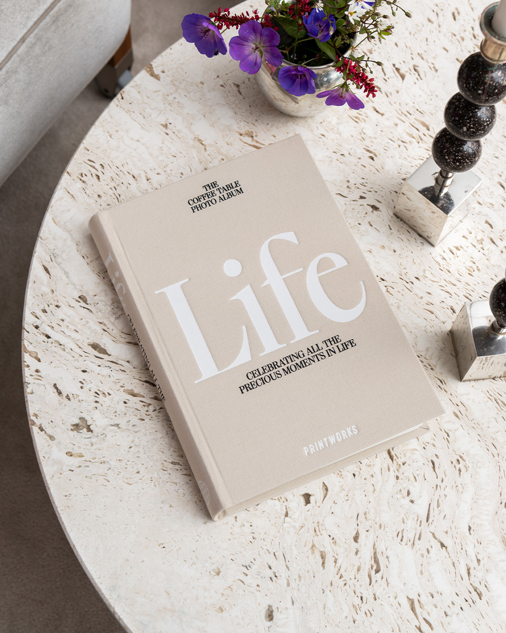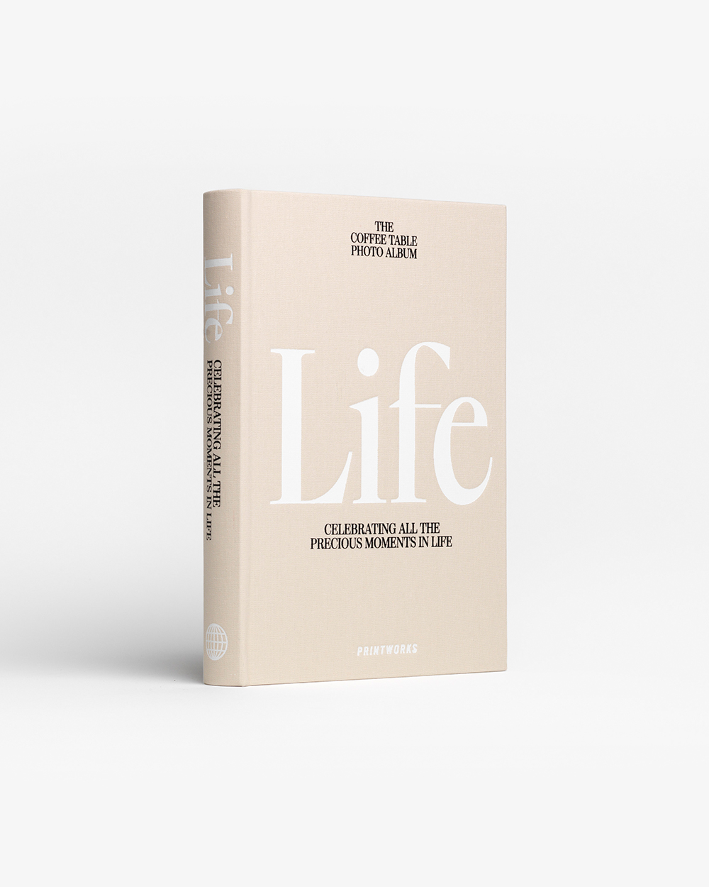 Discover our beautiful Life coffee table photo album, featuring an elegant beige cloth cover with white text.