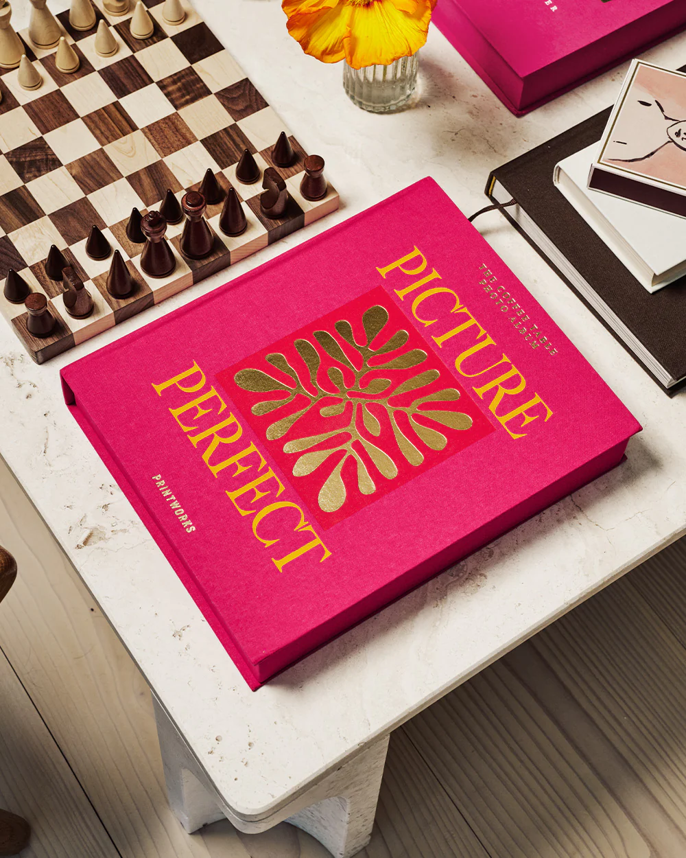 Discover our Picture Perfect coffee table photo album, featuring a vibrant, cerise cloth cover with orange text.